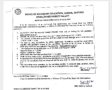 ଶିକ୍ଷା ଆଞ୍ଚଳିକ -ଆସନ୍ତା ଡିସେମ୍ବର ୧୭ରେ OTET-୨୦୨୫-BSE ପକ୍ଷରୁ ପ୍ରକାଶ ପାଇଲା ବିଜ୍ଞପ୍ତି-ଡିସେମ୍ବର ୧୭ରେ ଦୁଇଟି ସିଟିଂରେ ହେବ ପରୀକ୍ଷା-କାଲିଠାରୁ ଅନ୍ଲାଇନରେ ଆବେଦନ, ଶେଷ ତାରିଖ ନଭେମ୍ବର ୨୫ admin Nov 11, 2025 0 Spread the love